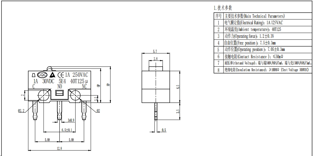 Aktibazio azkarreko abiarazte-mekanismo patentatu bat erabiliz, abiaraztearen erantzun-denbora ≤8 ms-koa da, errendimendua % 25 hobetuz mikro etengailu tradizionalekin alderatuta. Bidaia abiarazlea 0,3-1,0 mm artean kontrolatzen da, 1,5-4N arteko indar eragilearekin. Sakatzearen iritzia argia eta kurruskaria da, itsatsi edo jolas librerik gabe, "ukitu arina konektatzeko, askatu apurtzeko" kontrola zehatza ahalbidetzen du, abiarazte sentsibilitate handia behar duten agertokietarako ezin hobea. Kontaktuak purutasun handiko zilar-eztain aleazioz eginak dira eta puntuko soldadura zehatzarekin prozesatzen dira, hasierako kontaktu-erresistentzia ≤30mΩ-arekin. Karga nominalak 1A/250V AC eta 3A/125V AC onartzen ditu, korrontea igarotzean kontaktuaren berotzea edo erretzea eraginkortasunez saihestuz.